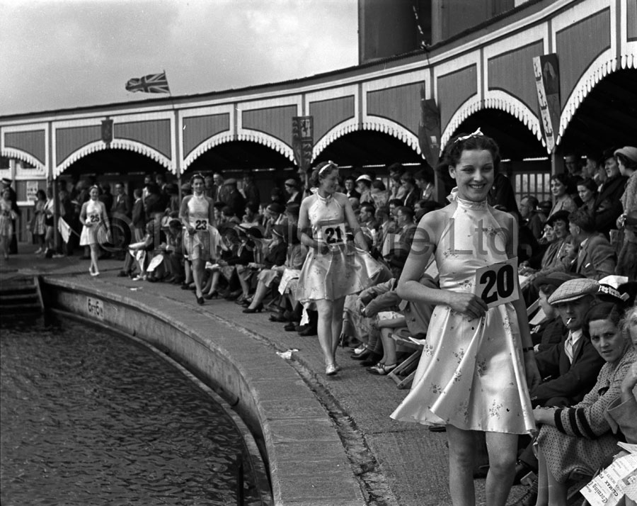 21st August 1937. Finalists for the Beauty Queen competition held at Cleethorpes Bathing Pool as part of Carnival Week. No. 20 is the winner, Kathleen Jebb of Grimsby, No. 21 is Irene Perkins of Cleethorpes, No. 23 is Vona Preston of Grimsby and No. 25 is