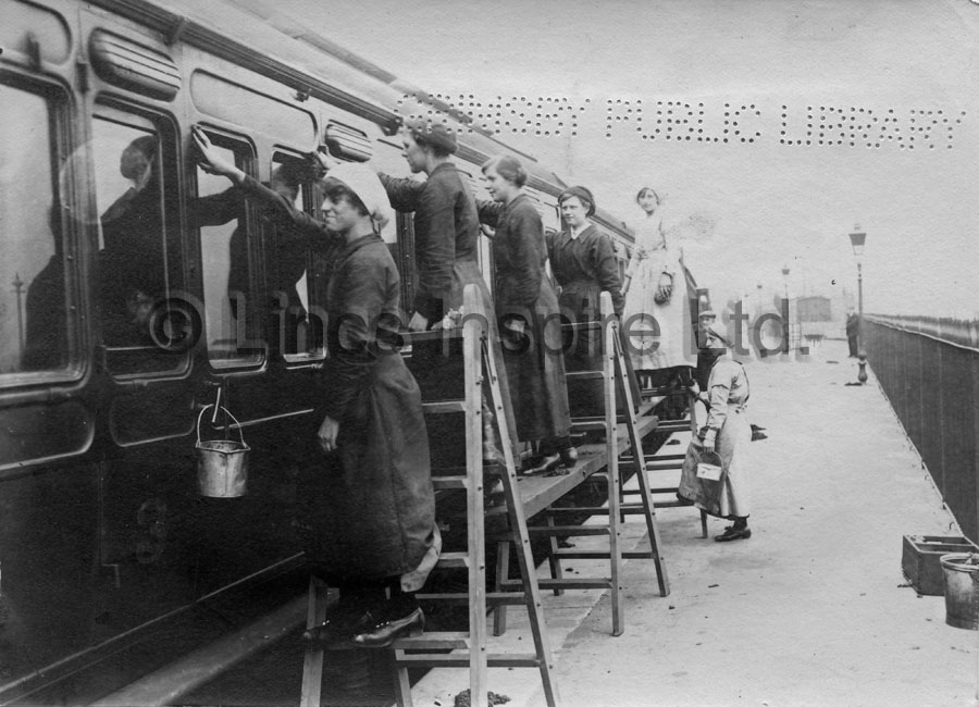 Female workers washing railway carriages of the Great Central Railway at Cleethorpes station during the First World War.