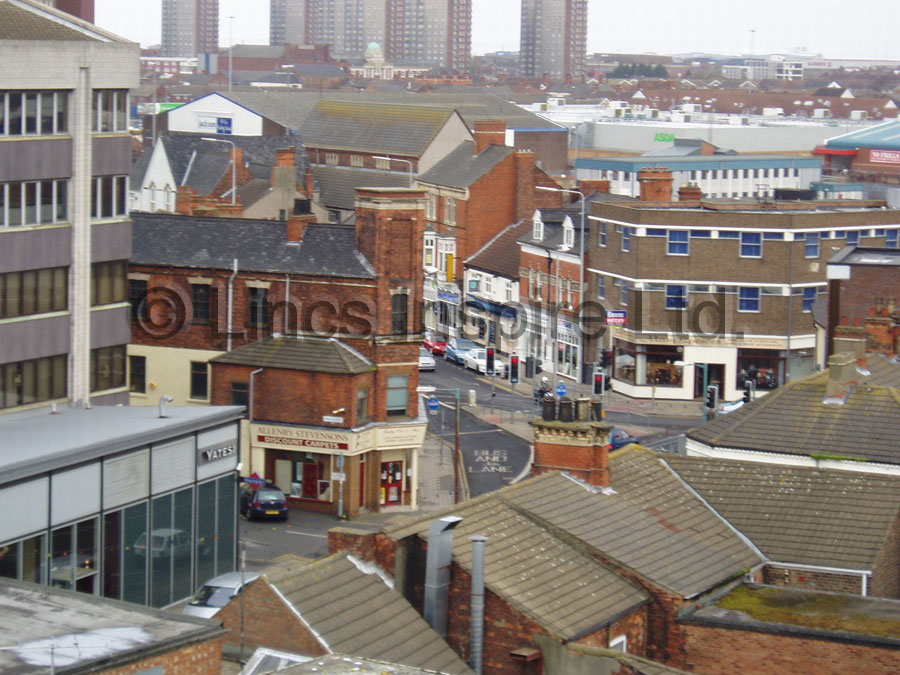 View from the roof of Grimsby Central Library looking towards Victoria Street with Allenby Stevensons on the left and the junction with Pasture Street on the right. In the distance the dome of Central Hall can be seen and beyond that the high rise flats o