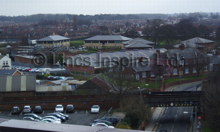 View from the roof of Grimsby Central Library down to Doughty Road. The Railway bridge goes across this view with the Almshouses on Doughty Road beyond the bridge. Buildings on Moss Road are in the centre.