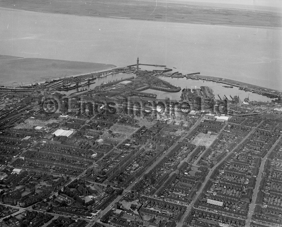 Aerial view of the East Marsh and docks, circa mid 1960s.