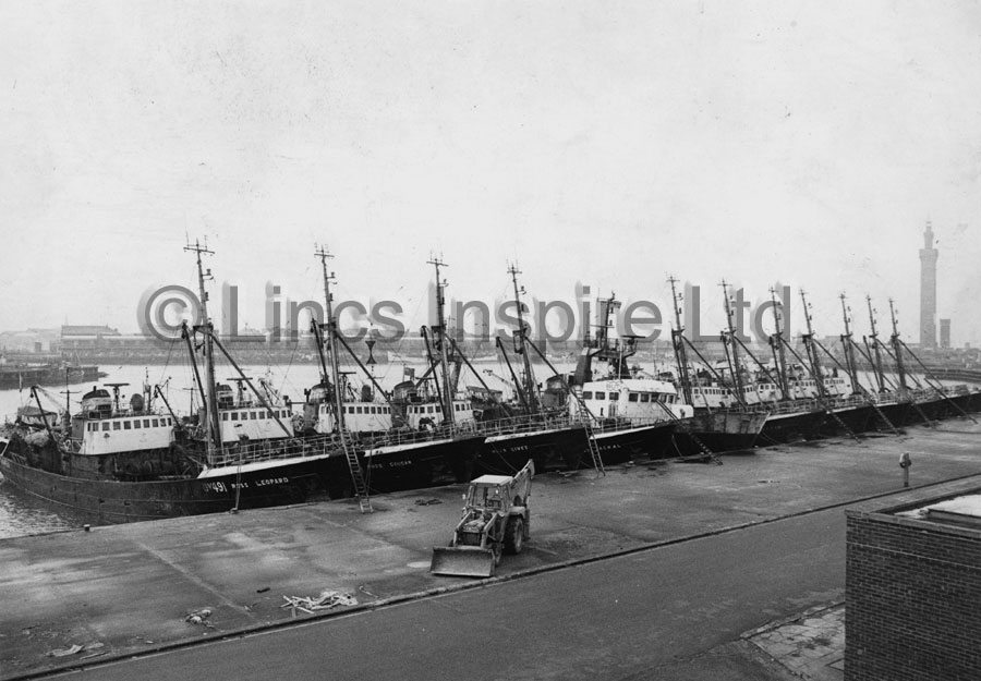 Trawlers on the North Wall including nine Ross "Cat" Trawlers. Identifiable trawlers left to right: Ross Leopard, Cougar, Civet, Jackel, Boston Halifax steam trawler, Ross Cheetah. All of these vessels carry the BUT (British United Trawlers) colours. Photographed circa 1984.