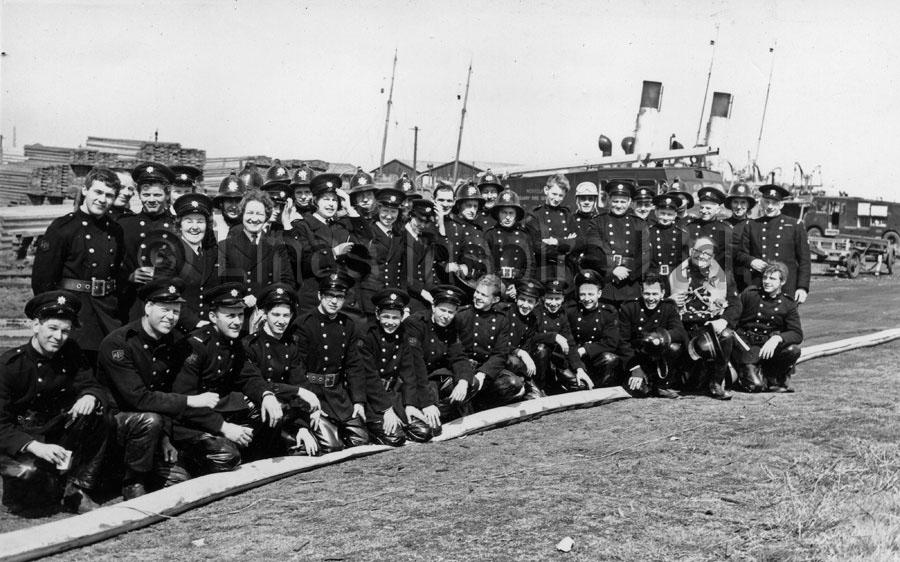 Grimsby's Auxillary Fire Service with members of the Norfolk Auxillary Fire Service during an exercise, probably at Alexandra Dock. Circa late 1960s.
