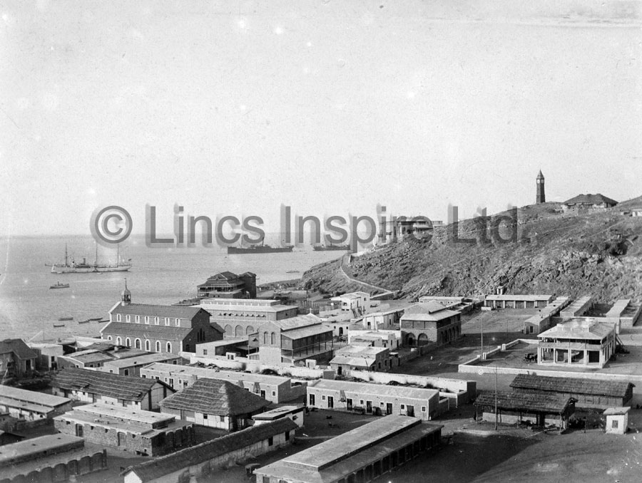 View of Steamer Point, Aden taken by a member of the Lincolnshire Regiment during their posting there from 1910-1912. St. Anthonys' Church is visible left of centre.