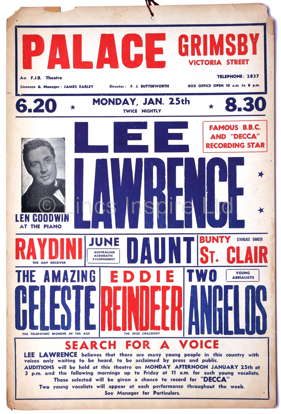 Popular singer Lee Lawrence appearing at the Palace Theatre Monday 25th January 1954 and also 'Search for a voice' auditions that week.